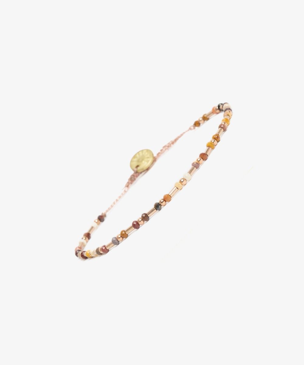 La colección Lirio transforma el diseño original de nuestras pulseras añadiendo cuentas bañadas en oro rosa, aportando un toque de elegancia a sus coloridos patrones. Creación exclusiva de Guanábana, diseñada en Madrid, esta pulsera está tejida a mano por artesanos colombianos en un telar siguiendo técnicas tradicionales. La abertura de la pulsera se ajusta para adaptarse a tu muñeca y está adornada con un medallón en el que está inscrito nuestro mantra: ¡Sé positivo!