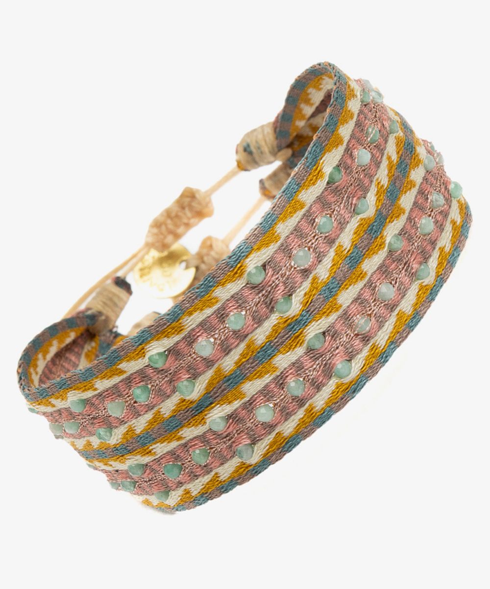 Guanábana da un giro a su tradicional ARGANTINA y la convierte en un accesorio brillante y colorido, con cuentas de piedras semipreciosas que aportan sofisticación a la pulsera. La argantina 2CMX está tejida a mano por artesanas usando un telar manual y acabada con un cierre ajustable y una medallita en bronce con nuestro mantra para que no lo olvides: BE POSITIVE.
