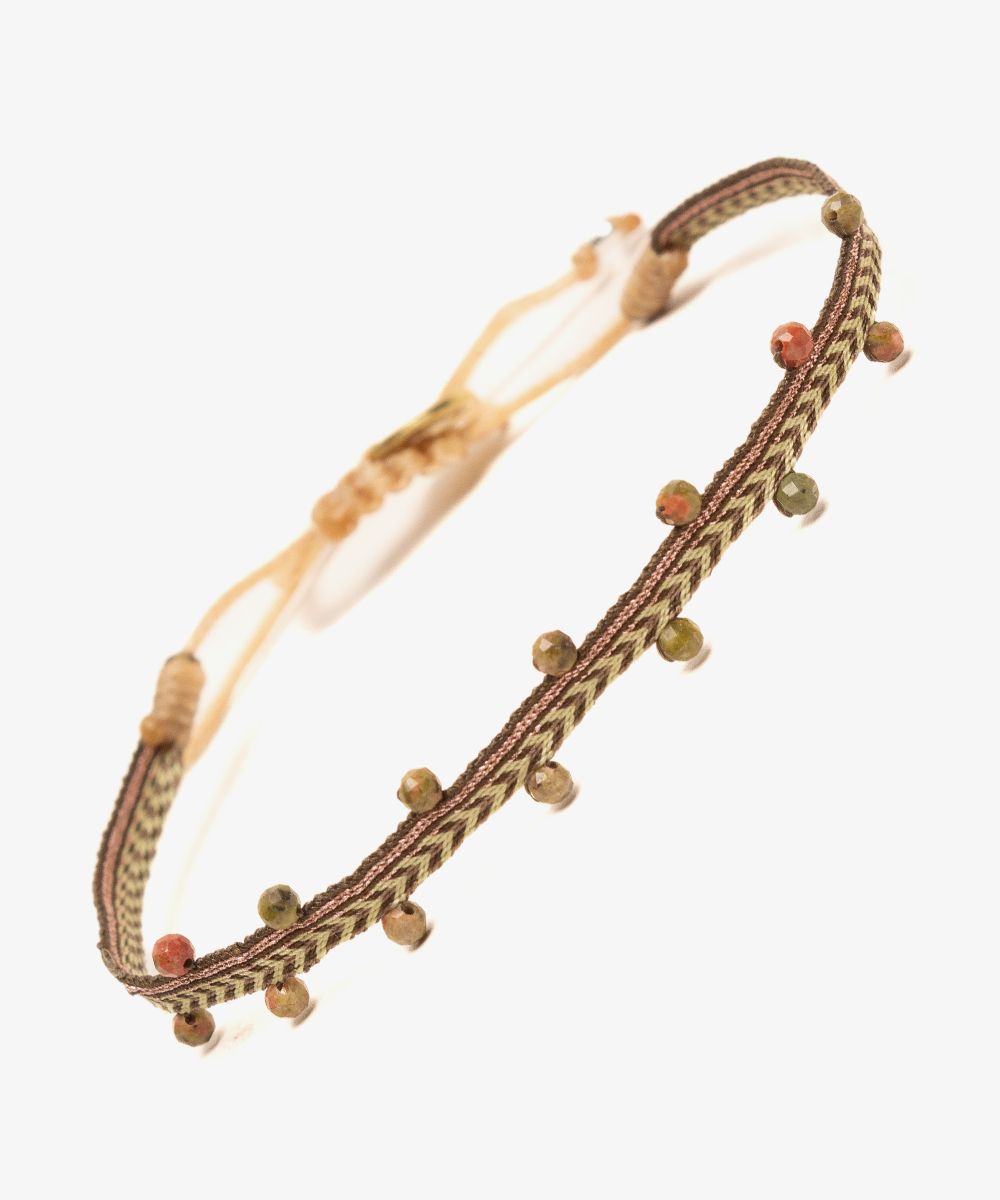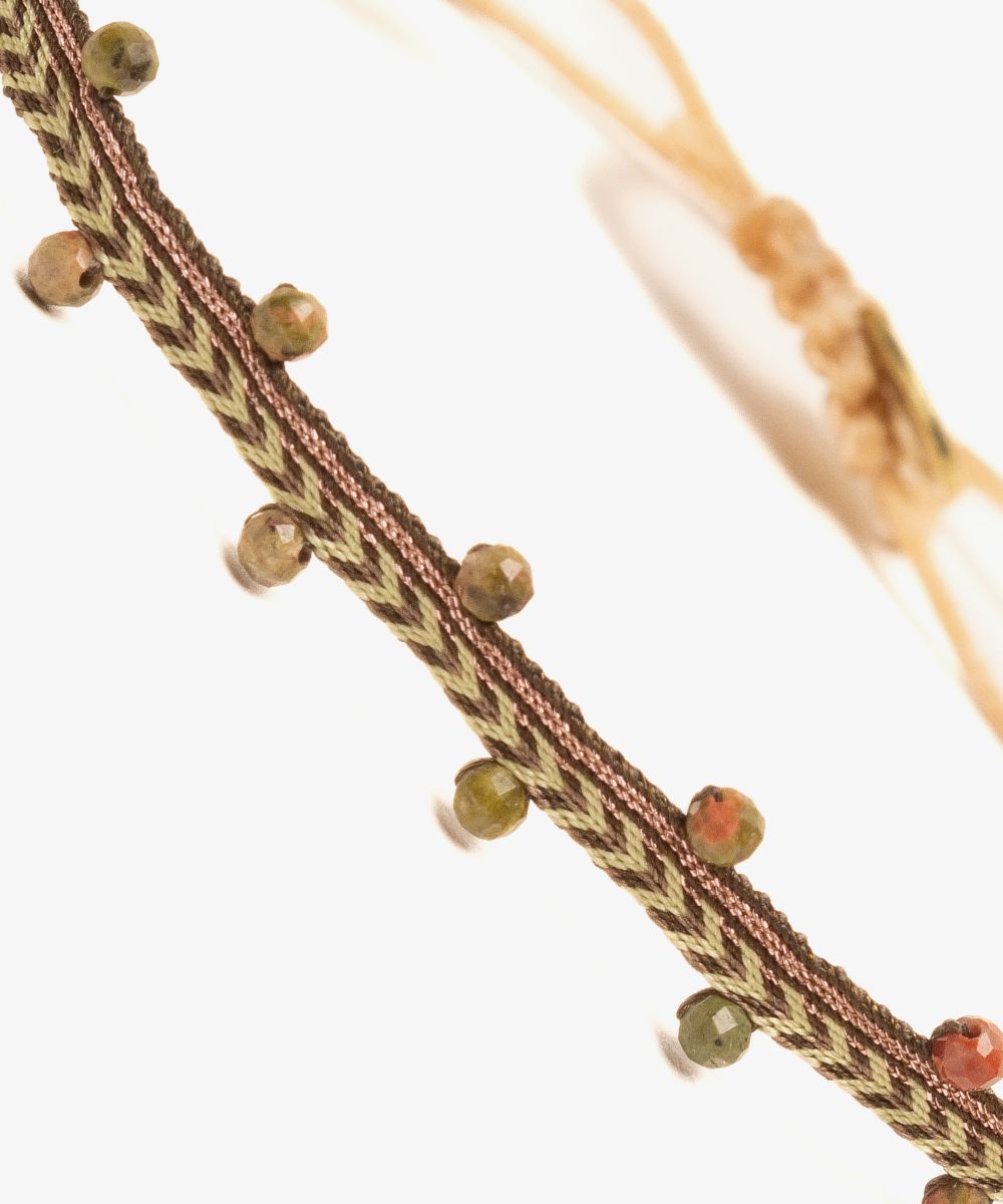 Guanábana da un giro a su tradicional ARGANTINA y la convierte en un accesorio brillante y colorido, con cuentas de piedras semipreciosas que aportan sofisticación a la pulsera. La argantina ALAMEIN está tejida a mano por artesanas usando un telar manual y acabada con un cierre ajustable y una medallita en bronce con nuestro mantra para que no lo olvides: BE POSITIVE.
