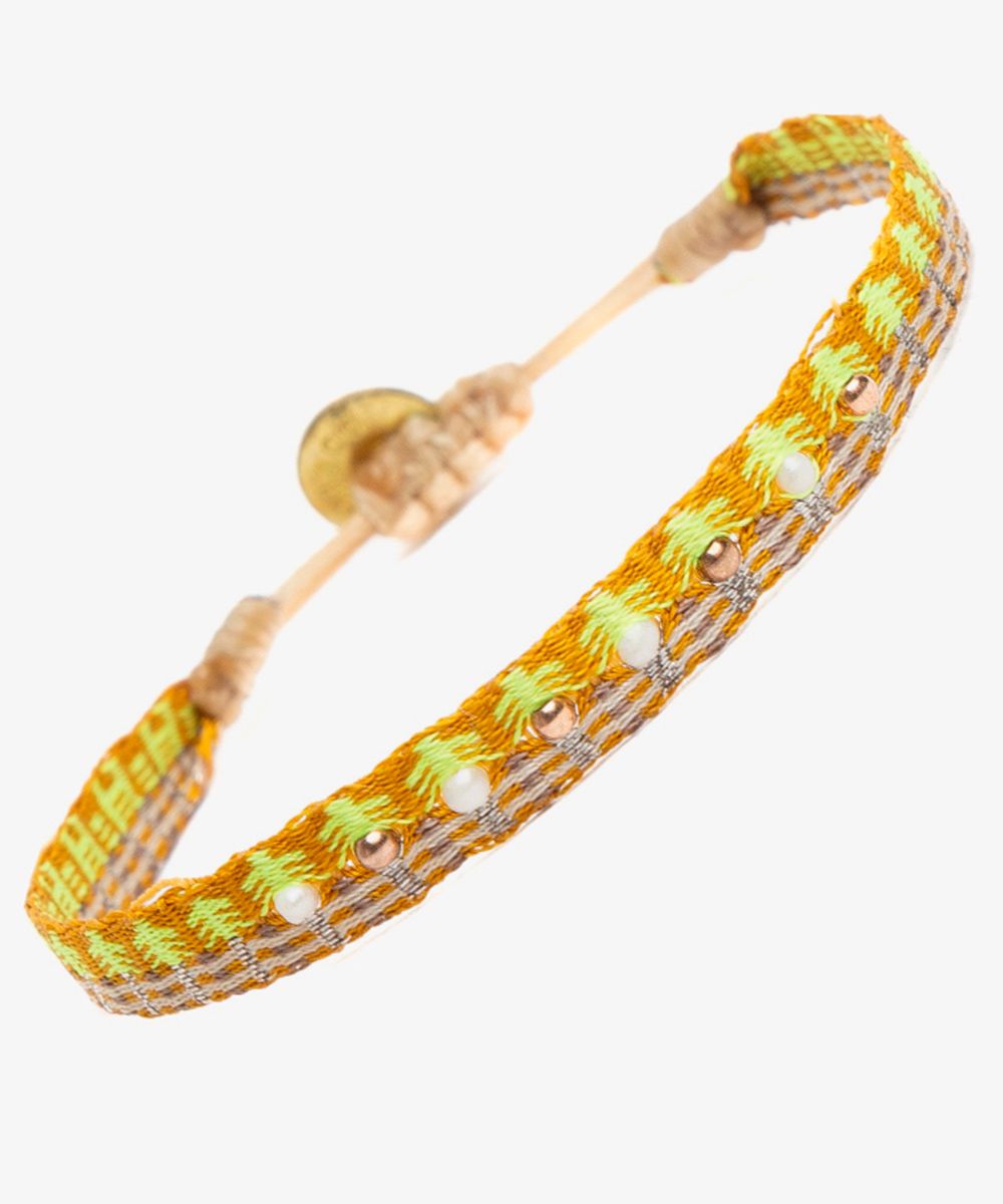 Guanábana da un giro a su tradicional ARGANTINA y la convierte en un accesorio brillante y colorido, con cuentas de piedras semipreciosas que aportan sofisticación a la pulsera. La argantina ALAMEIN está tejida a mano por artesanas usando un telar manual y acabada con un cierre ajustable y una medallita en bronce con nuestro mantra para que no lo olvides: BE POSITIVE.