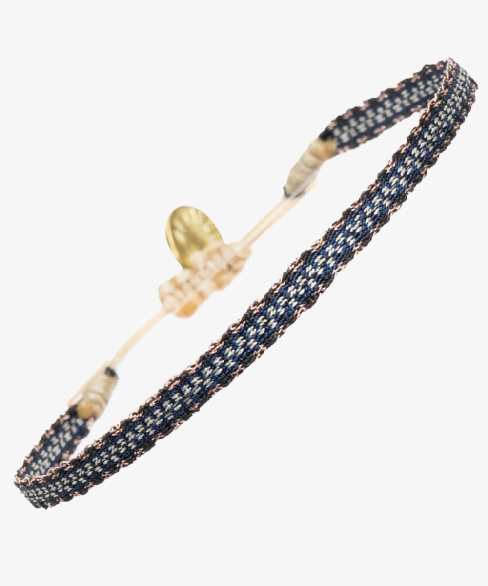 Esta pulsera está diseñada en nuestras oficinas centrales de Madrid. Tejida en un telar manual por artesanos en Colombia, utilizando técnicas antiguas. Cada pulsera está tejida con 40 hilos y cuenta con un cierre para ajustarla a la muñeca. Nuestro consejo: Puedes llevarla sola o mezclándola con varias más!