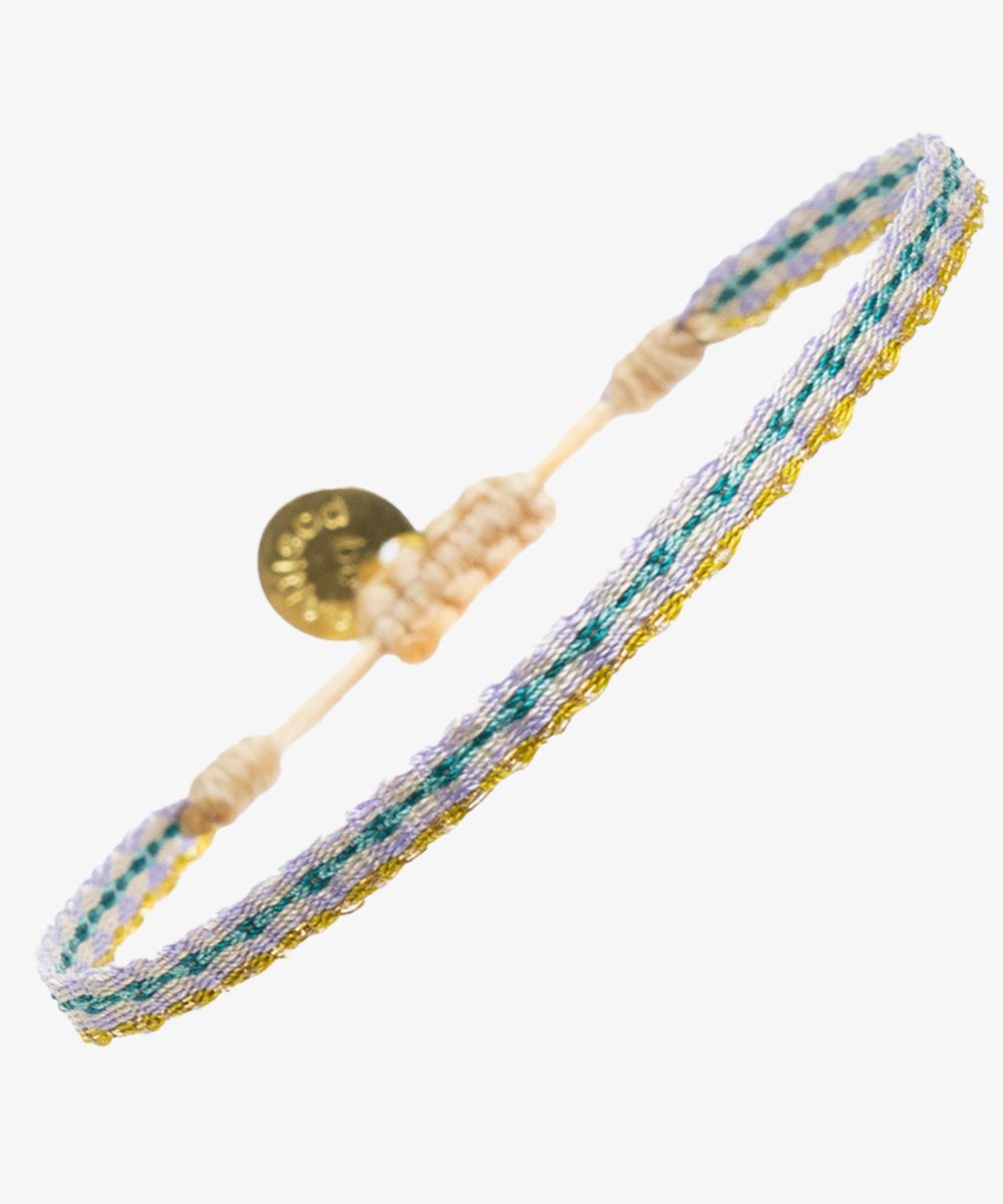 Esta pulsera está diseñada en nuestras oficinas centrales de Madrid. Tejida en un telar manual por artesanos en Colombia, utilizando técnicas antiguas. Cada pulsera está tejida con 40 hilos y cuenta con un cierre para ajustarla a la muñeca. Nuestro consejo: Puedes llevarla sola o mezclándola con varias más!