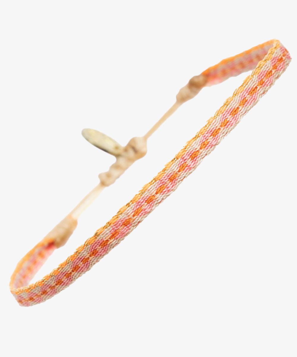 Esta pulsera está diseñada en nuestras oficinas centrales de Madrid. Tejida en un telar manual por artesanos en Colombia, utilizando técnicas antiguas. Cada pulsera está tejida con 40 hilos y cuenta con un cierre para ajustarla a la muñeca. Nuestro consejo: Puedes llevarla sola o mezclándola con varias más!