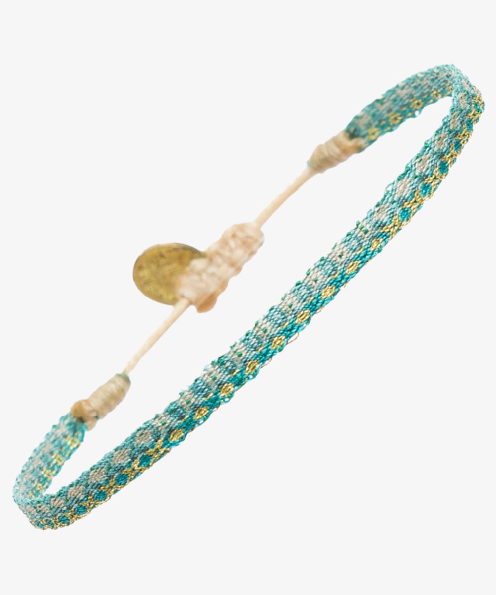 Esta pulsera está diseñada en nuestras oficinas centrales de Madrid. Tejida en un telar manual por artesanos en Colombia, utilizando técnicas antiguas. Cada pulsera está tejida con 40 hilos y cuenta con un cierre para ajustarla a la muñeca. Nuestro consejo: Puedes llevarla sola o mezclándola con varias más!