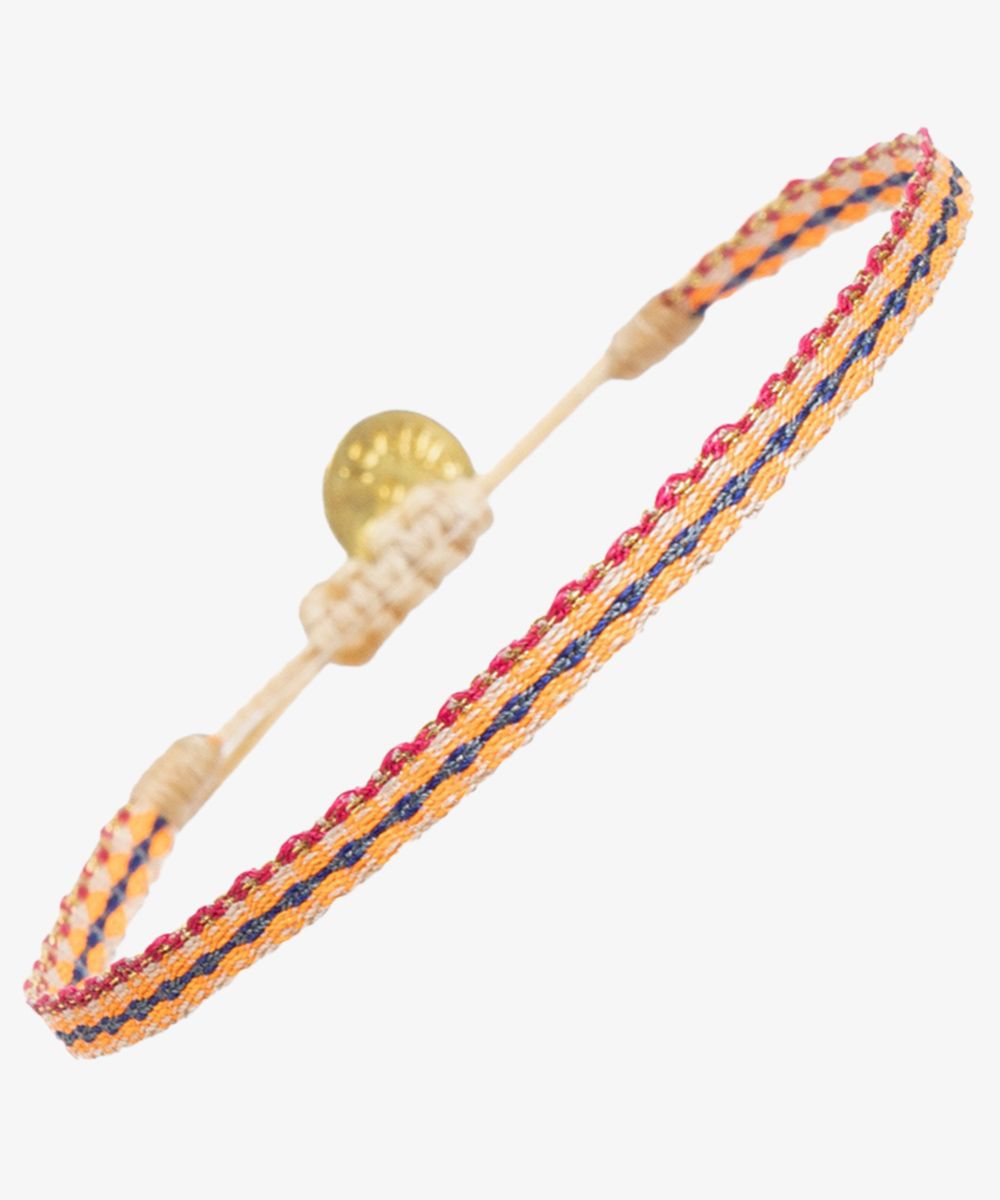 Esta pulsera está diseñada en nuestras oficinas centrales de Madrid. Tejida en un telar manual por artesanos en Colombia, utilizando técnicas antiguas. Cada pulsera está tejida con 40 hilos y cuenta con un cierre para ajustarla a la muñeca. Nuestro consejo: Puedes llevarla sola o mezclándola con varias más!