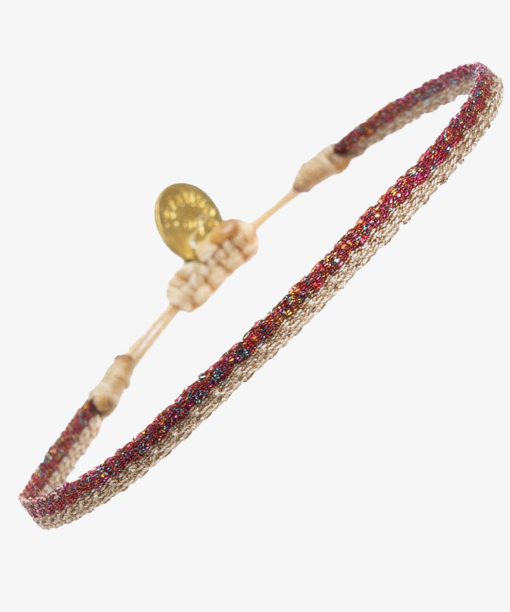 Esta pulsera está diseñada en nuestras oficinas centrales de Madrid. Tejida en un telar manual por artesanos en Colombia, utilizando técnicas antiguas. Cada pulsera está tejida con 40 hilos y cuenta con un cierre para ajustarla a la muñeca. Nuestro consejo: Puedes llevarla sola o mezclándola con varias más!