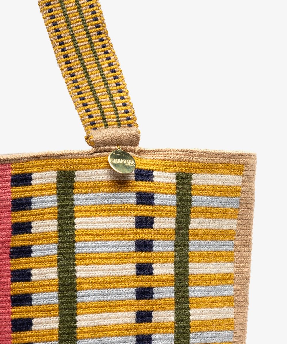 Gracias a las manos de cientos de mujeres Wayuu en Colombia y a los diseñadores de GUANÁBANA en Madrid, nuestro bolso clásico se presenta en una versión más pequeña. Tejido a mano por artesanas en Colombia, los colores y patrones de este bolso, y su asa larga, lo convierten en un imprescindible que puedes usar en cualquiera ocasión. Revisa su base y admira las diferencias que trae cada uno de ellos. Este bolso cierra con dos pompones tejidos y nuestro sello en bronce con el leitmotiv de GUANABANA: BE POSITIVE.