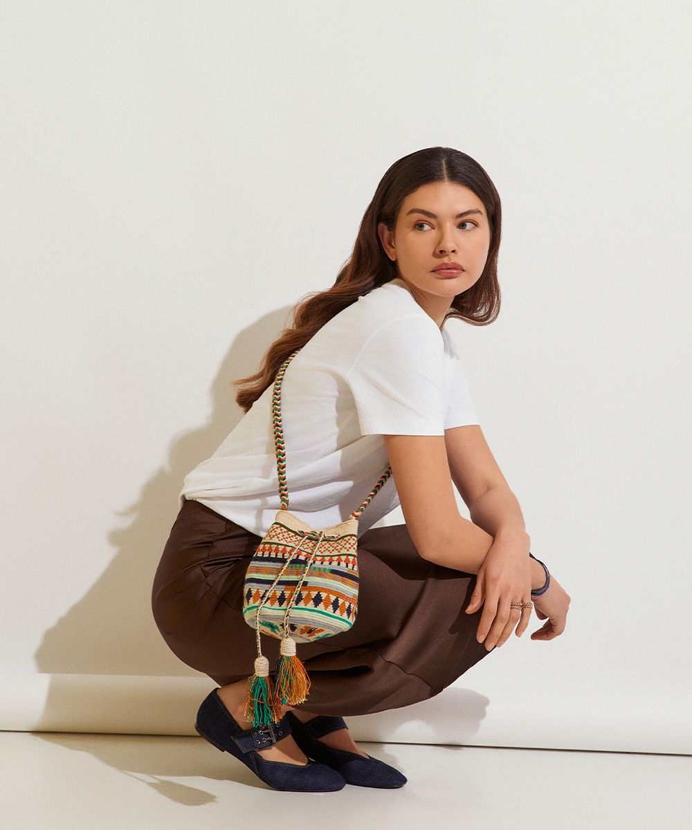 Gracias a las manos de cientos de mujeres Wayuu en Colombia y a los diseñadores de GUANÁBANA en Madrid, nuestro bolso clásico se presenta en una versión más pequeña. Tejido a mano por artesanas en Colombia, los colores y patrones de este bolso, y su asa larga, lo convierten en un imprescindible que puedes usar en cualquiera ocasión. Revisa su base y admira las diferencias que trae cada uno de ellos. Este bolso cierra con dos pompones tejidos y nuestro sello en bronce con el leitmotiv de GUANABANA: BE POSITIVE.