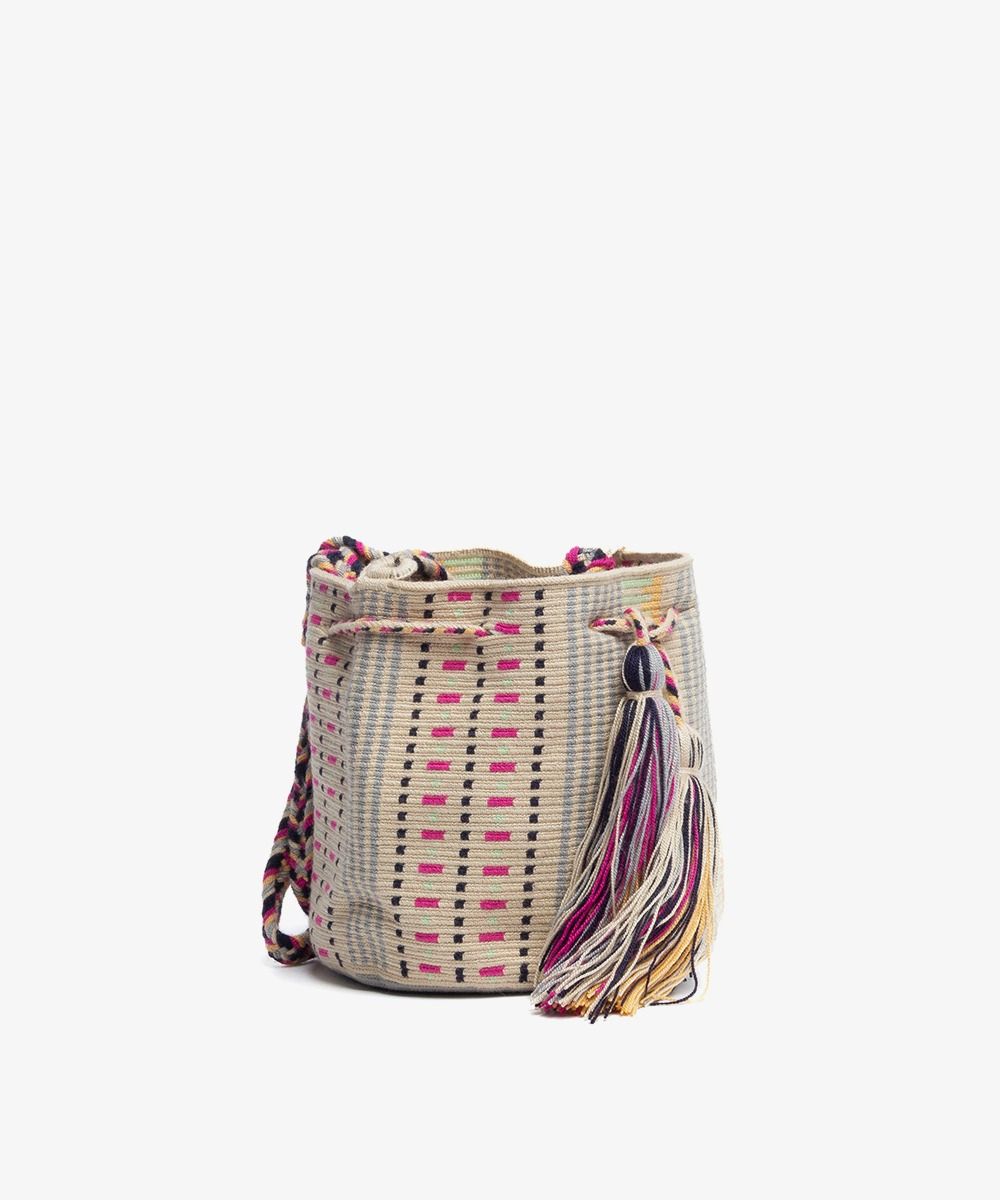 Gracias a las manos de cientos de mujeres Wayuu en Colombia y a los diseñadores de GUANÁBANA en Madrid, nuestro bolso clásico se presenta en una versión más pequeña. Tejido a mano por artesanas en Colombia, los colores y patrones de este bolso, y su asa larga, lo convierten en un imprescindible que puedes usar en cualquiera ocasión. Revisa su base y admira las diferencias que trae cada uno de ellos. Este bolso cierra con dos pompones tejidos y nuestro sello en bronce con el leitmotiv de GUANABANA: BE POSITIVE.