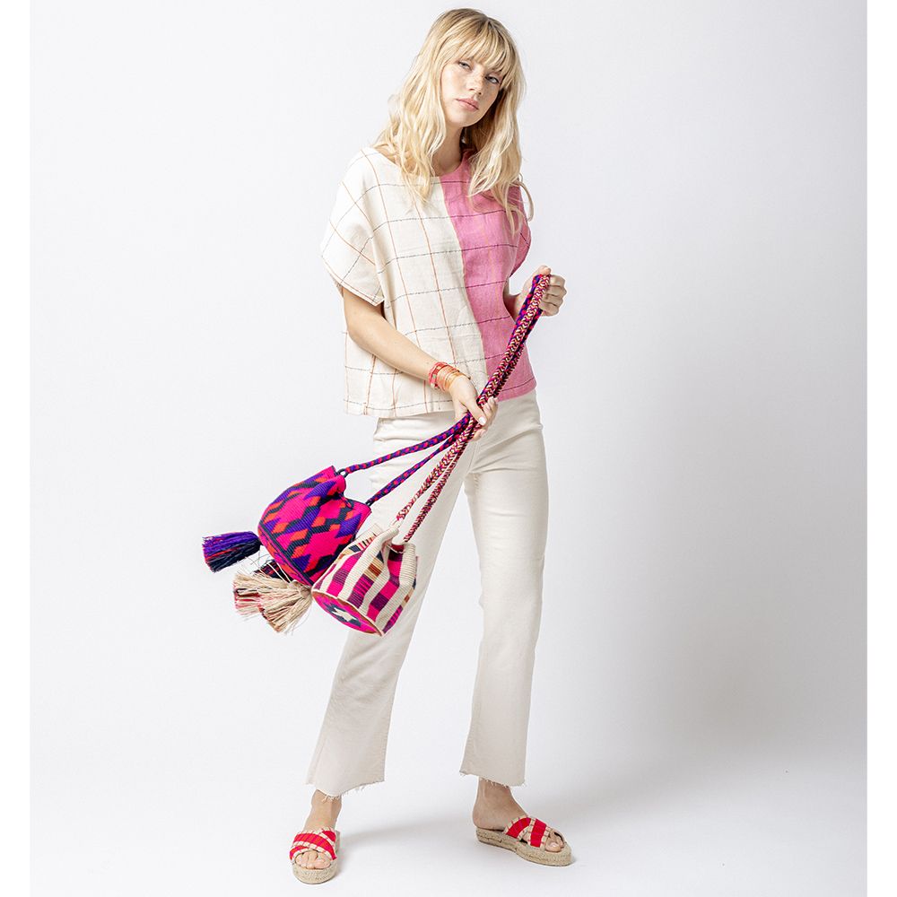 Gracias a las manos de cientos de mujeres Wayuu en Colombia y a los diseñadores de GUANÁBANA en Madrid, nuestro bolso clásico se presenta en una versión más pequeña. Tejido a mano por artesanas en Colombia, los colores y patrones de este bolso, y su asa larga, lo convierten en un imprescindible que puedes usar en cualquiera ocasión. Revisa su base y admira las diferencias que trae cada uno de ellos. Este bolso cierra con dos pompones tejidos y nuestro sello en bronce con el leitmotiv de GUANABANA: BE POSITIVE.