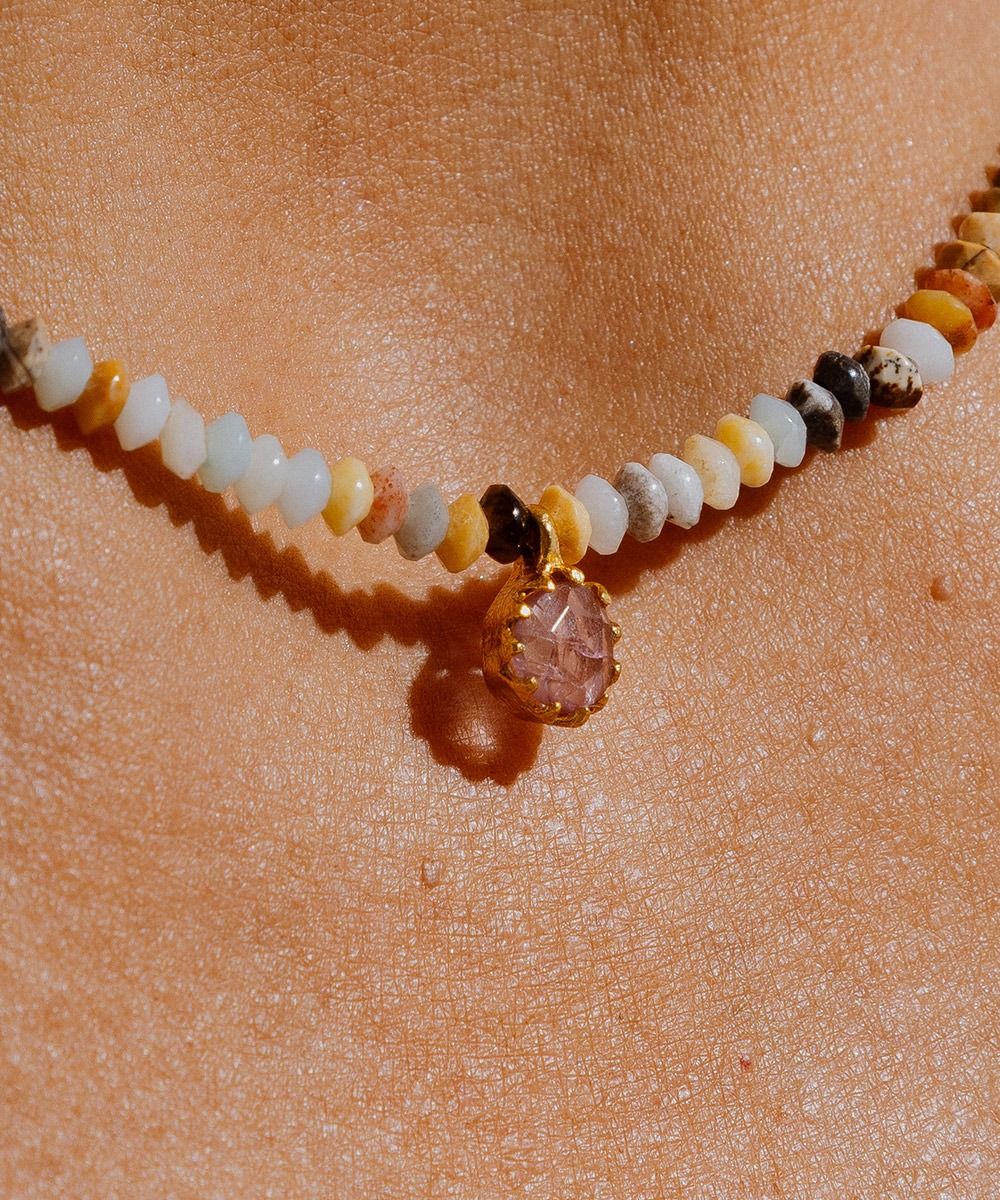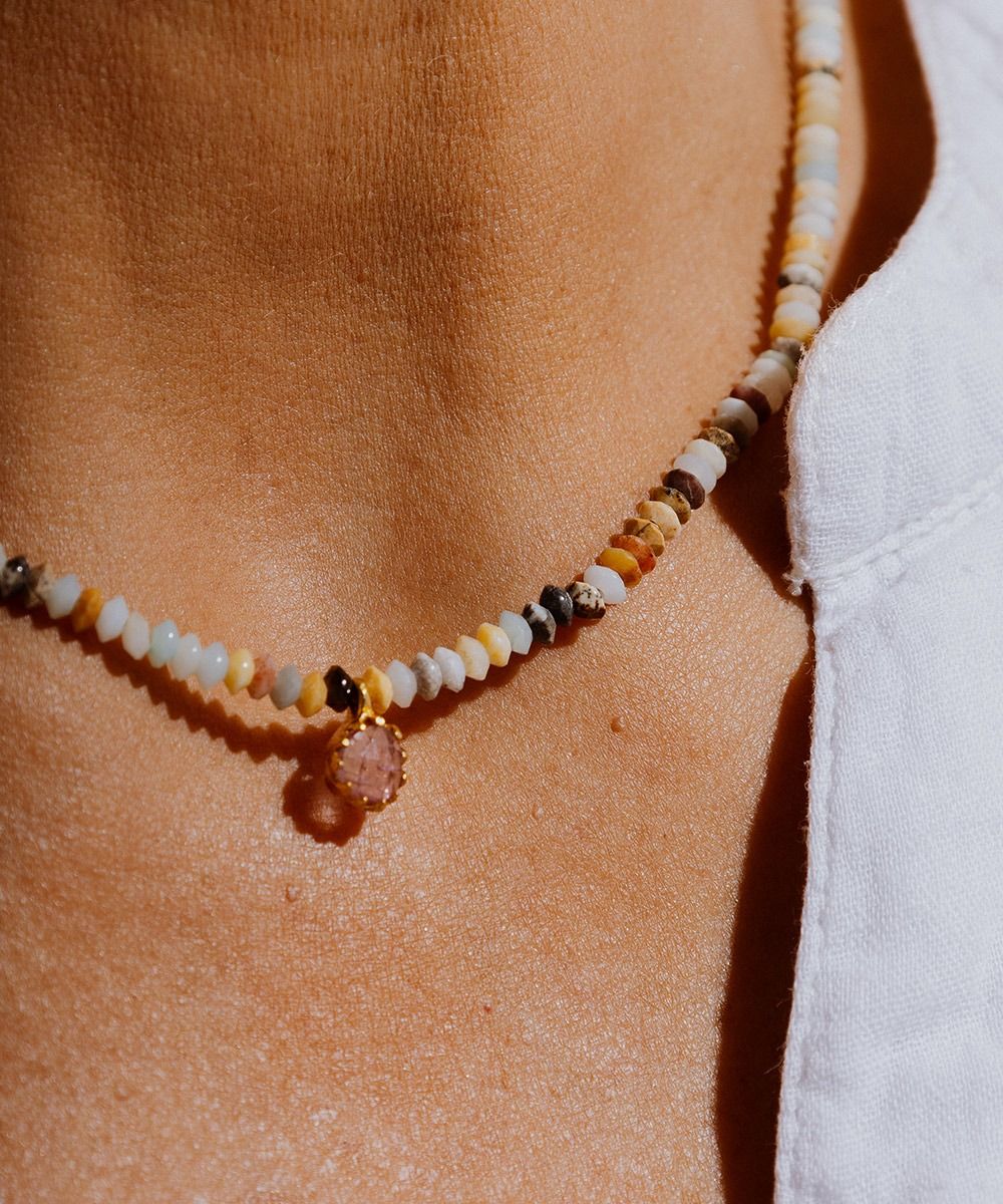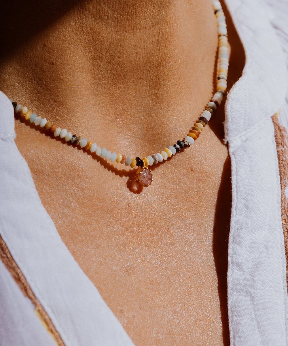 Delicado y femenino, un complemento con un toque étnico que rematará cualquier look, tanto en verano como en invierno. Este diseño exclusivo de Guanábana cuenta con un dije que incluye una piedra semi preciosa, dándole un toque elegante al collar. Nuestro consejo: puedes combinar collares de diferentes largos para crear tu propio conjunto. Nuestro consejo: puedes combinar collares de diferentes largos para crear tu propio conjunto.