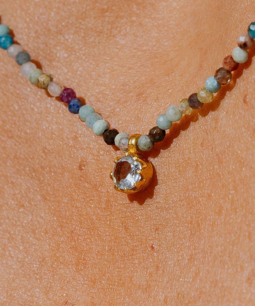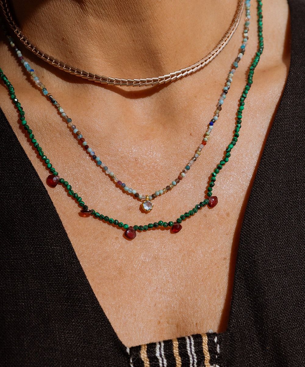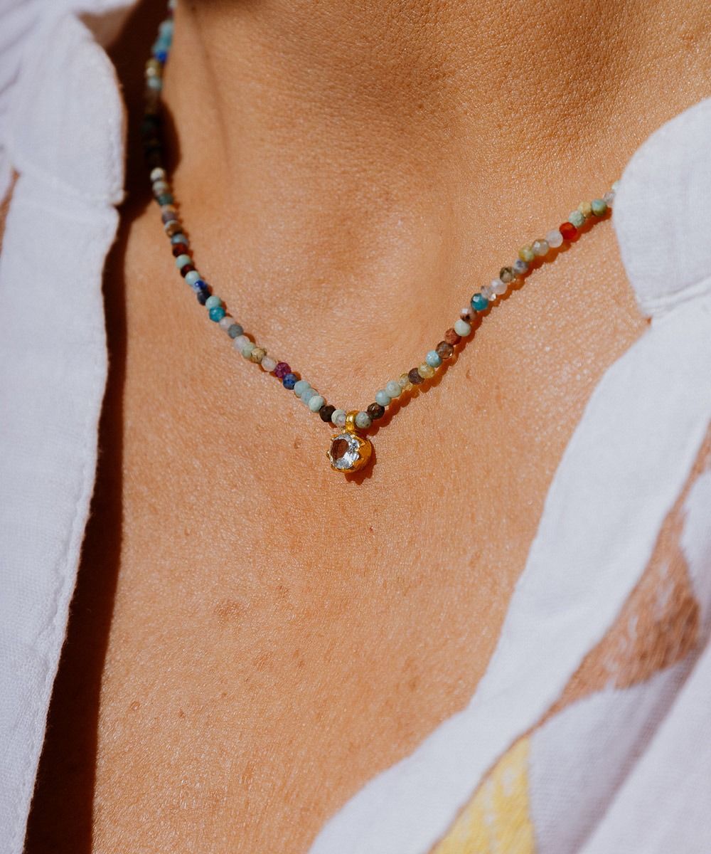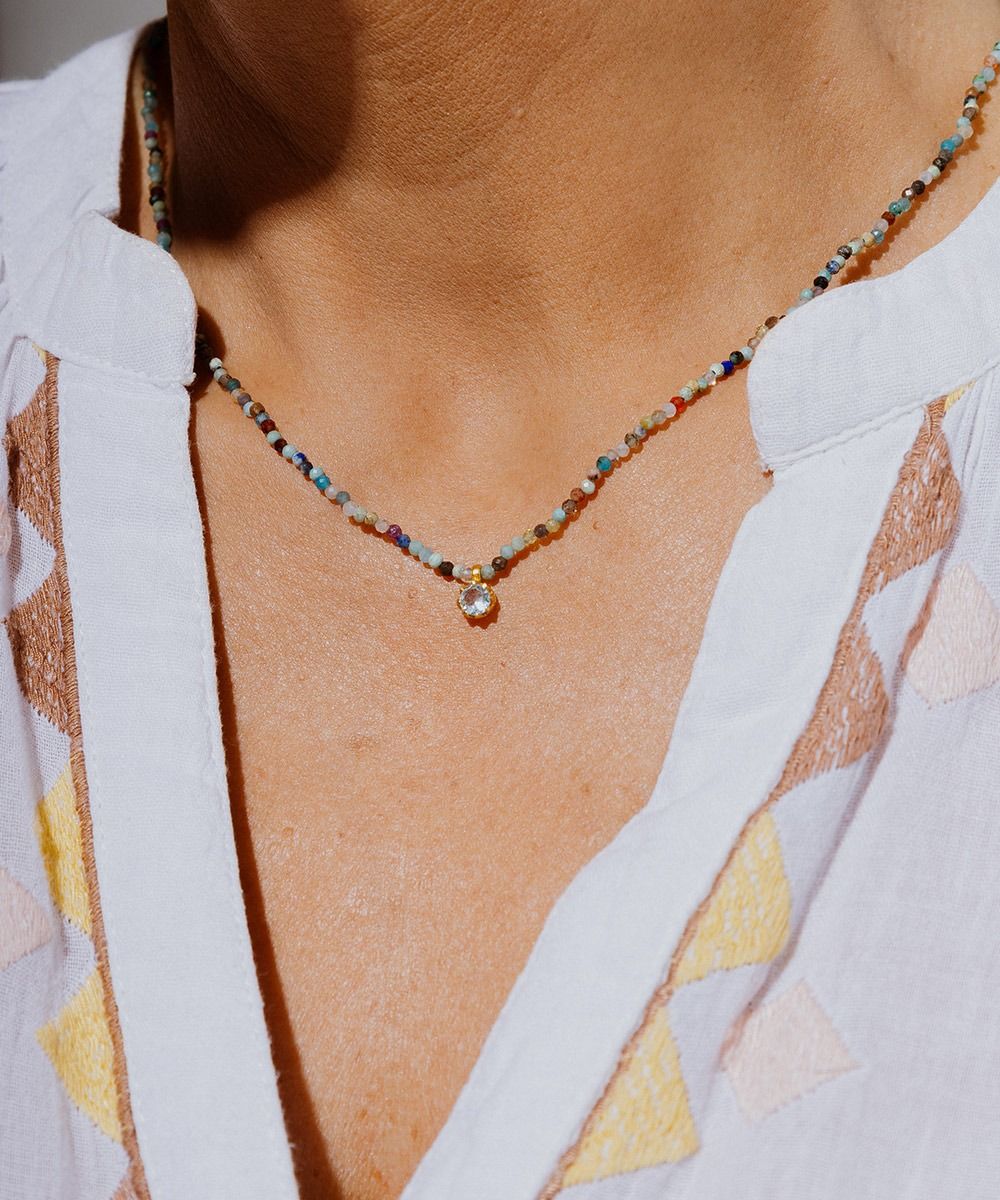 Delicado y femenino, un complemento con un toque étnico que rematará cualquier look, tanto en verano como en invierno. Este diseño exclusivo de Guanábana cuenta con un dije que incluye una piedra semi preciosa, dándole un toque elegante al collar. Nuestro consejo: puedes combinar collares de diferentes largos para crear tu propio conjunto. Nuestro consejo: puedes combinar collares de diferentes largos para crear tu propio conjunto.
