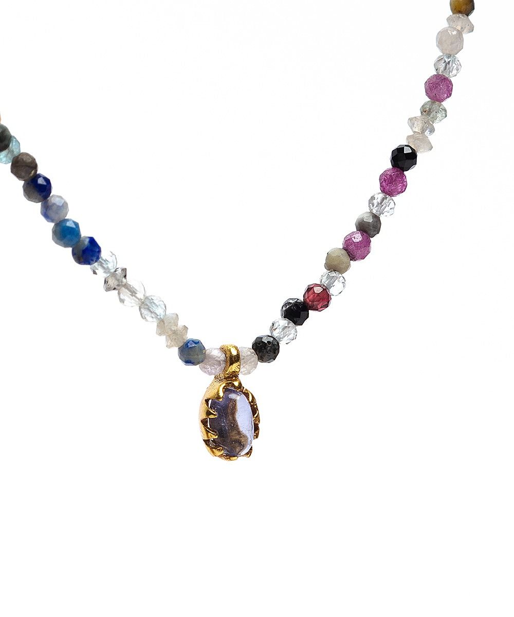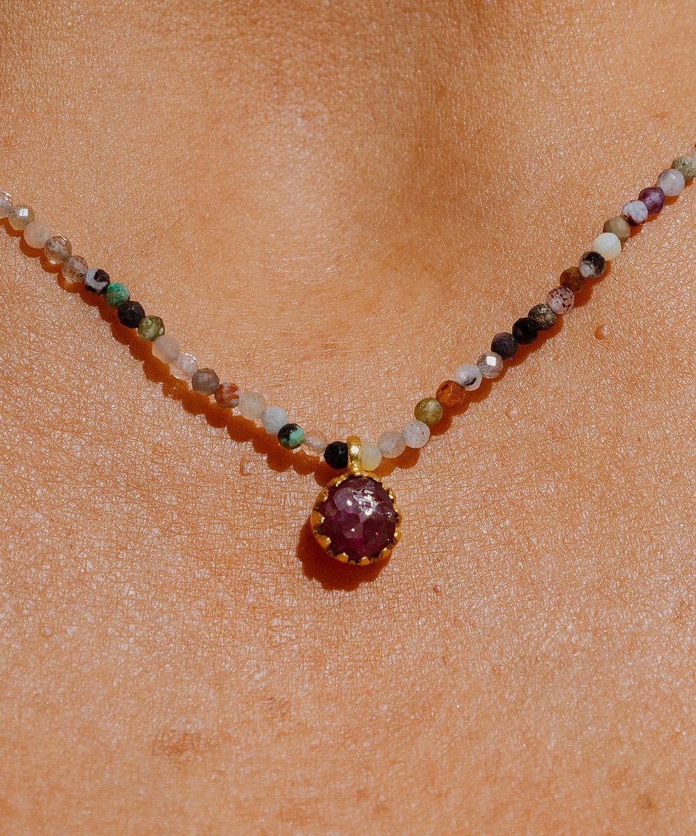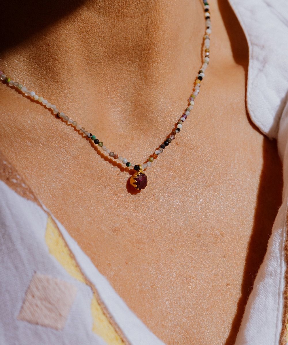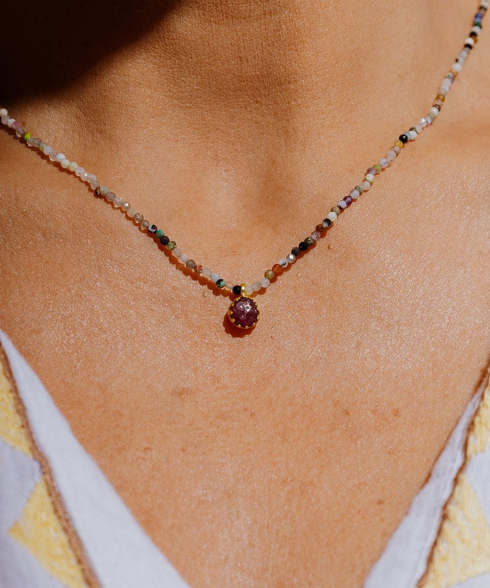 Delicado y femenino, un complemento con un toque étnico que rematará cualquier look, tanto en verano como en invierno. Este diseño exclusivo de Guanábana cuenta con un dije que incluye una piedra semi preciosa, dándole un toque elegante al collar. Nuestro consejo: puedes combinar collares de diferentes largos para crear tu propio conjunto. Nuestro consejo: puedes combinar collares de diferentes largos para crear tu propio conjunto.