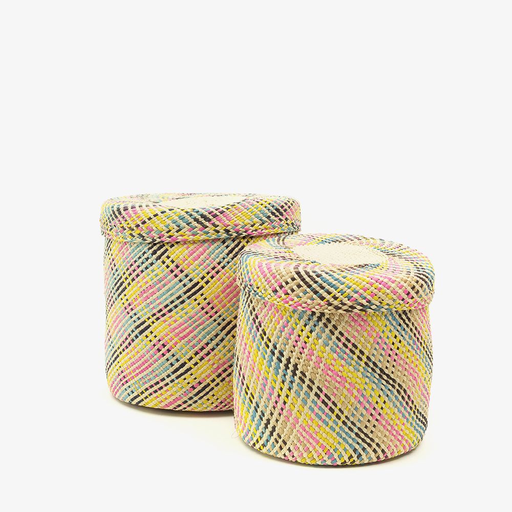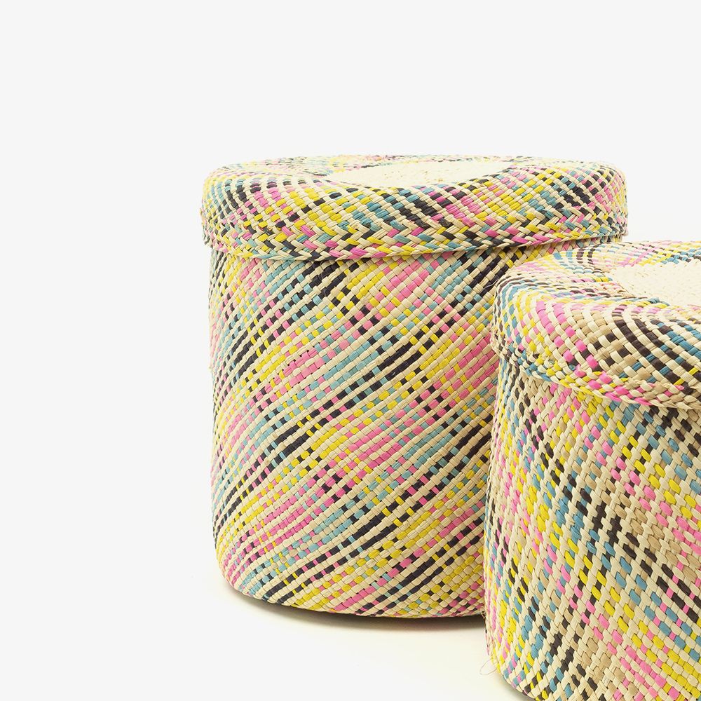 Nuestros complementos para casa están hechos a mano por artesanas utilizando la técnica de tejido en iraca, típica de la tradición colombiana. La iraca, o paja toquilla, es una fibra natural que proviene de la “Carludovica palmata”, de cuyas hojas se obtienen unos finos hilos que son teñidos para darles color. Una vez secos, los artesanos entretejen los hilos con los diferentes colores para crear nuestros contenedores.