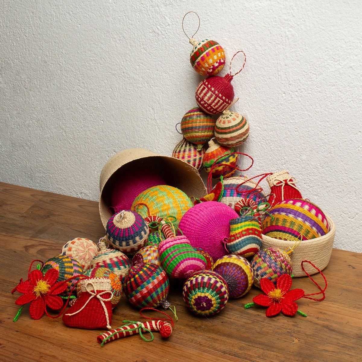 Nuestros adornos están hechos a mano por artesanas utilizando la técnica de tejido en iraca, típica de la tradición colombiana. La iraca, o paja toquilla, es una fibra natural que proviene de la “Carludovica palmata”, de cuyas hojas se obtienen unos finos hilos que son teñidos para darles color. Una vez secos, los artesanos entretejen los hilos con los diferentes colores para crear estos adornos de navidad.