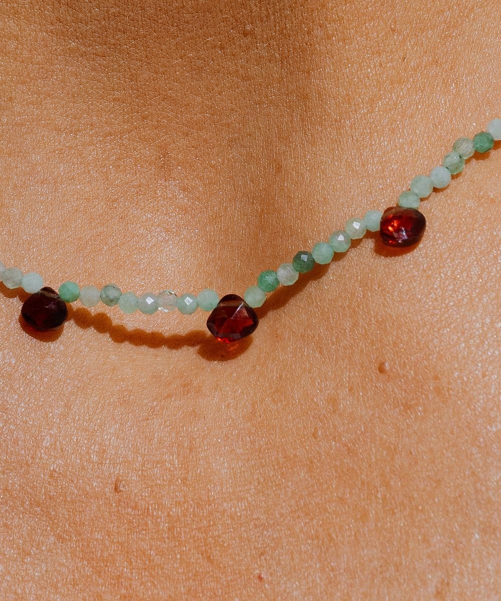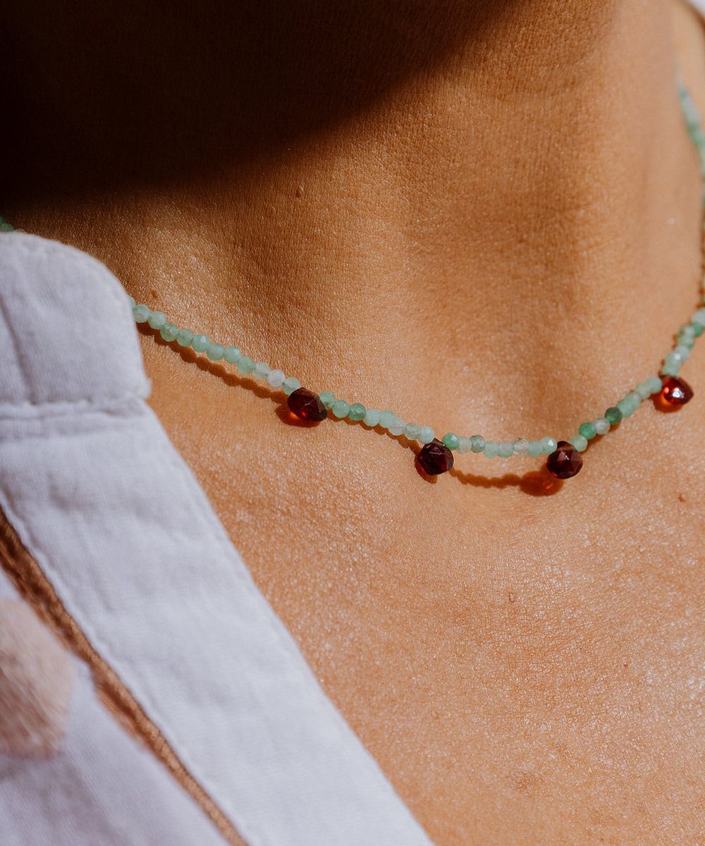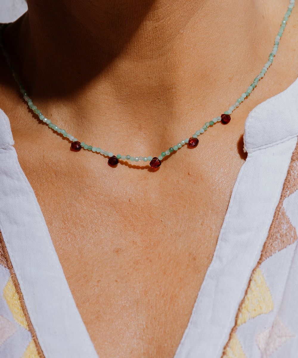 Delicado y femenino, un complemento con un toque étnico que rematará cualquier look, tanto en verano como en invierno. Este diseño exclusivo de Guanábana tiene 5 gotas de piedras semipreciosas, dando un toque moderno y diferente al collar. Nuestro consejo: puedes combinar collares de diferentes largos para crear tu propio atuendo. Nuestro consejo: puedes combinar collares de diferentes largos para crear tu propio atuendo.