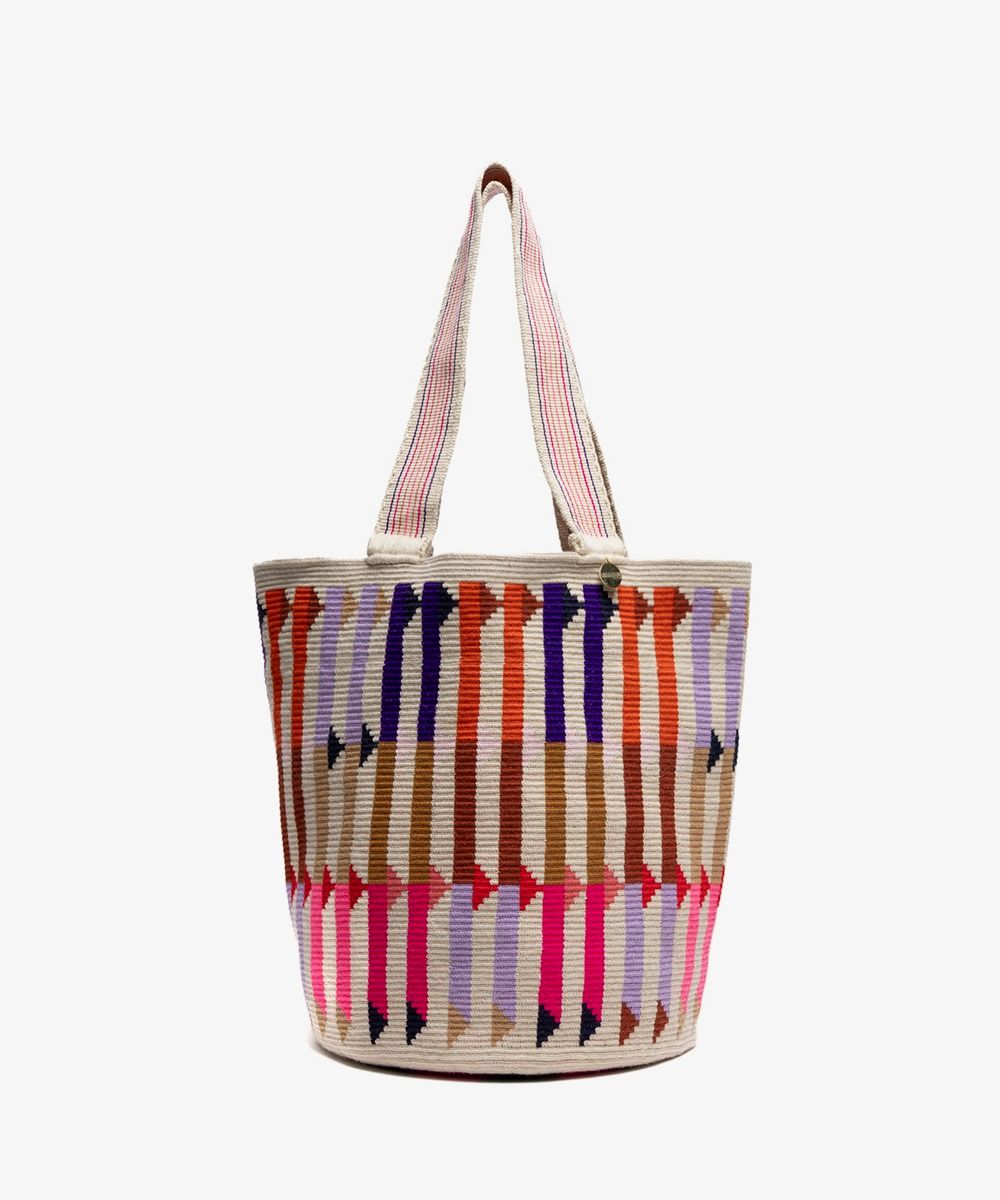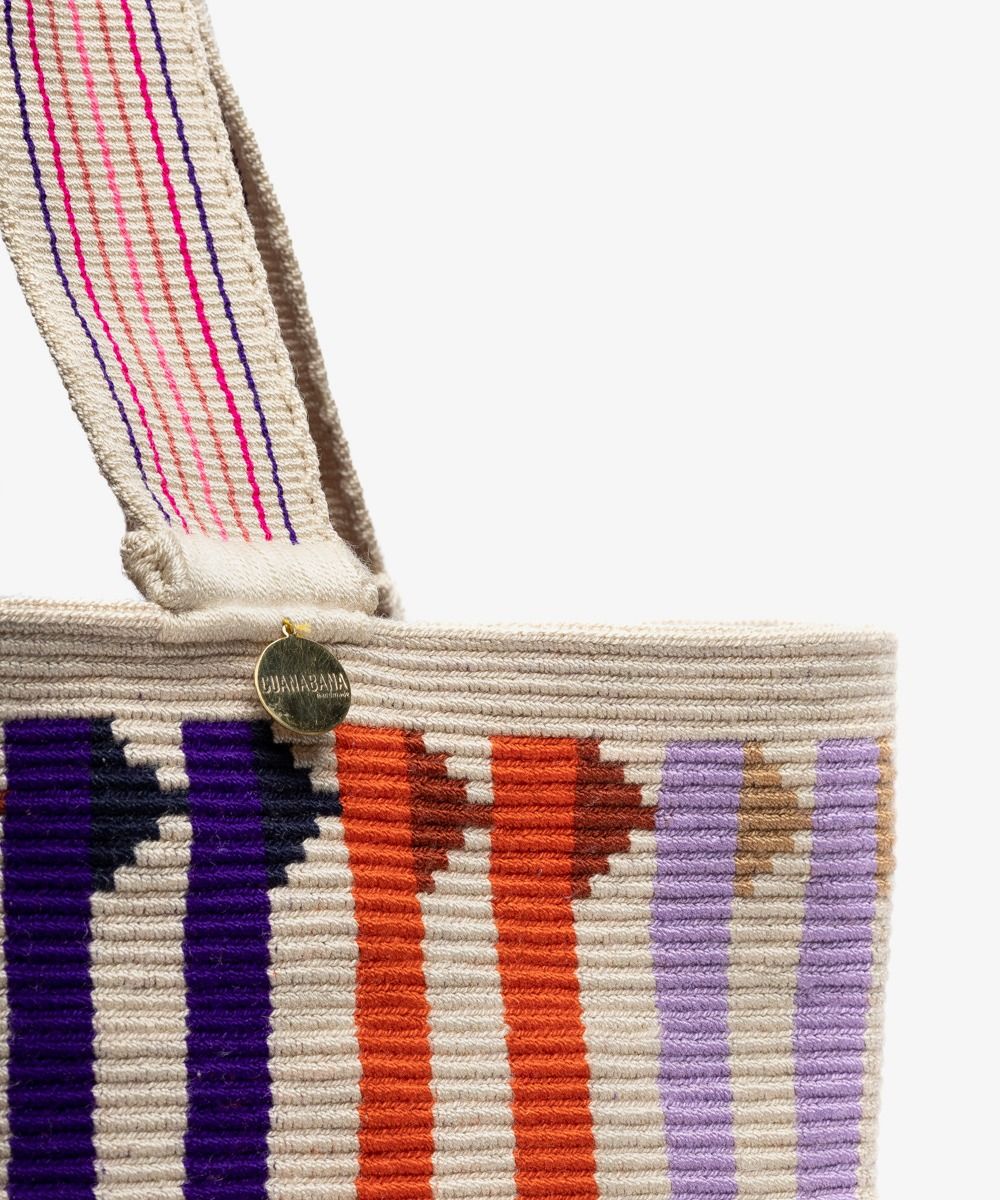 Guanábana reinventa el clásico tote bag y le da un toque boho-chic con sus diseños geométricos y vibrantes, creados en Madrid y hechos a mano por las Wayuu en Colombia. La puntada de este modelo, tejido en crochet, es más suelta para hacerlo más ligero y fácil de llevar. Tiene un asa tipo banda para llevarlo al hombro, por lo que es ideal para el trabajo, la universidad o incluso la playa. Acabado con una medallita de bronce con nuestro mantra para que no lo olvides: BE POSITIVE. Este bolso es un diseño exclusivo de Guanábana.