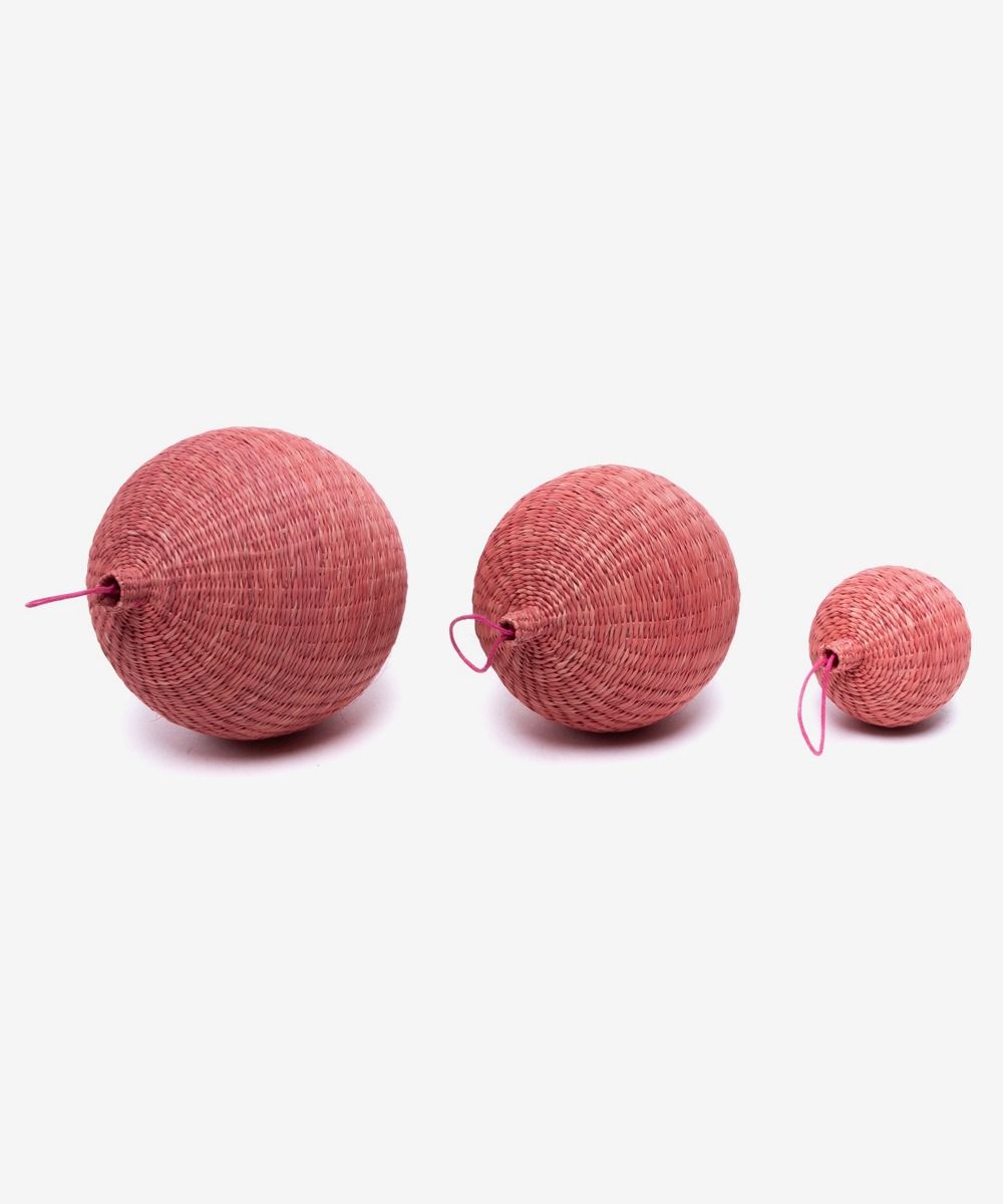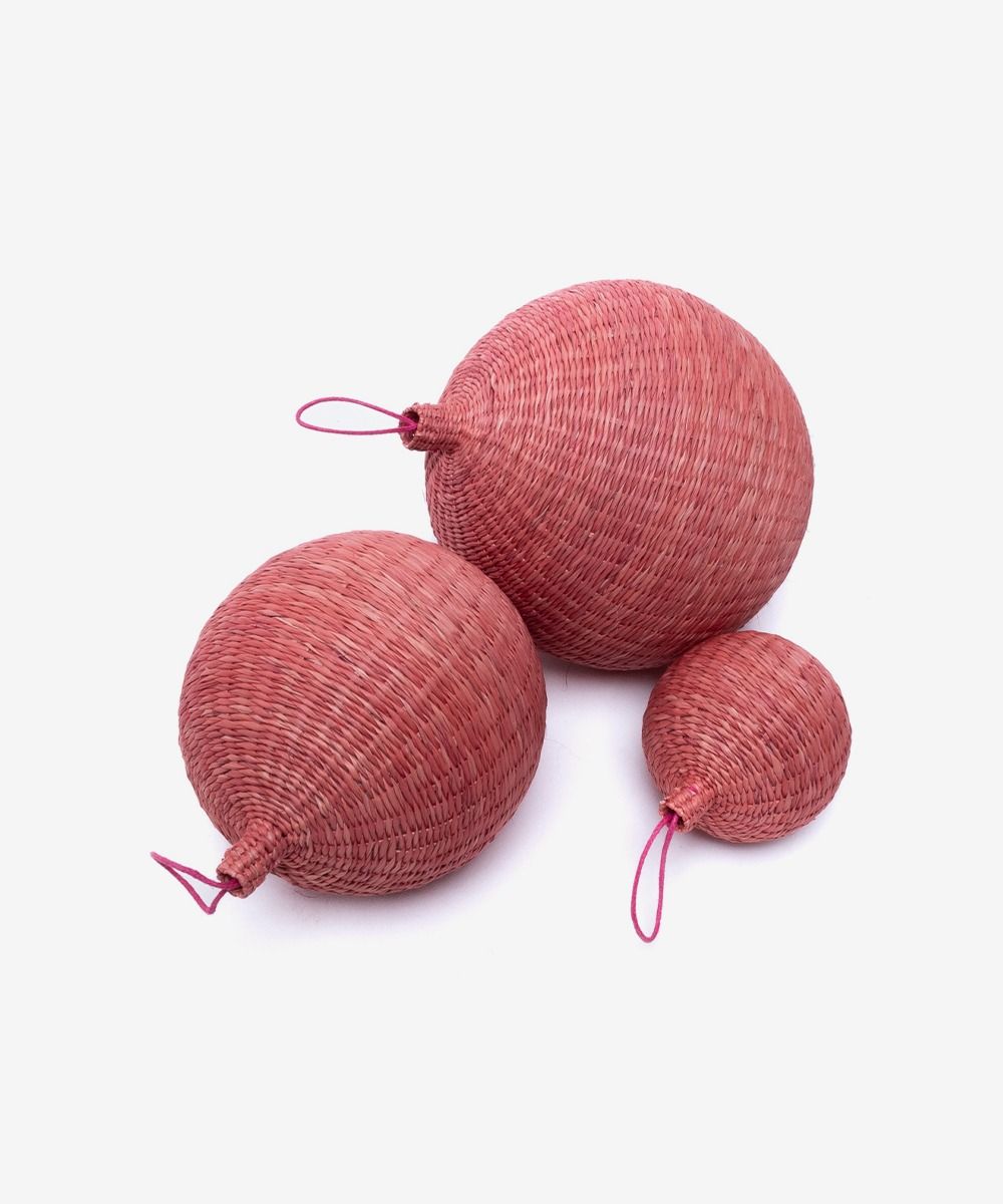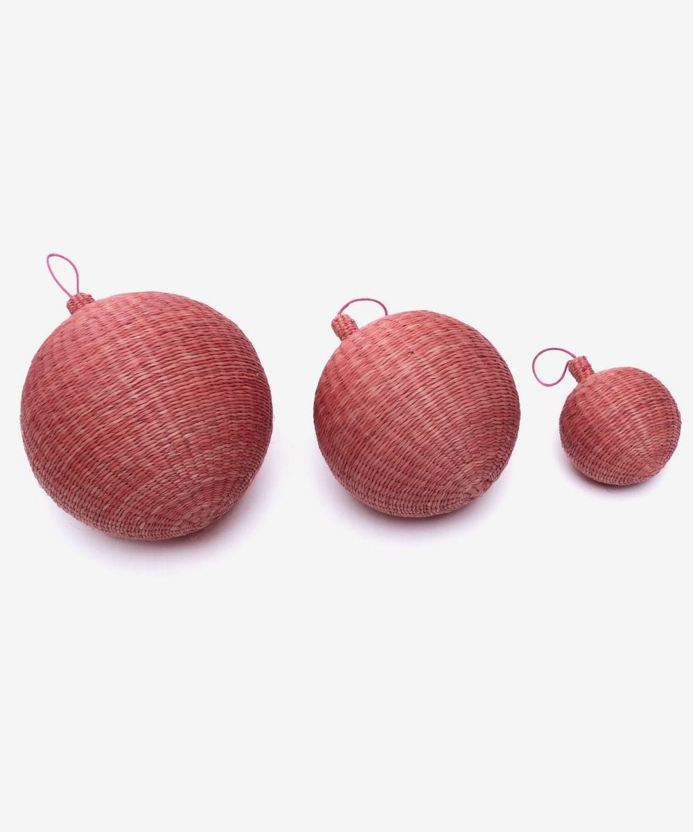 Nuestros ornamentos, bolas de Navidad, están hechas a mano por artesanas utilizando la técnica de tejido en iraca, típica de la tradición colombiana. La iraca, o paja toquilla, es una fibra natural que proviene de la “Carludovica palmata”, de cuyas hojas se obtienen unos finos hilos que son teñidos para darles color. Una vez secos, los artesanos entretejen los hilos con los diferentes colores para crear estas bolas de navidad.